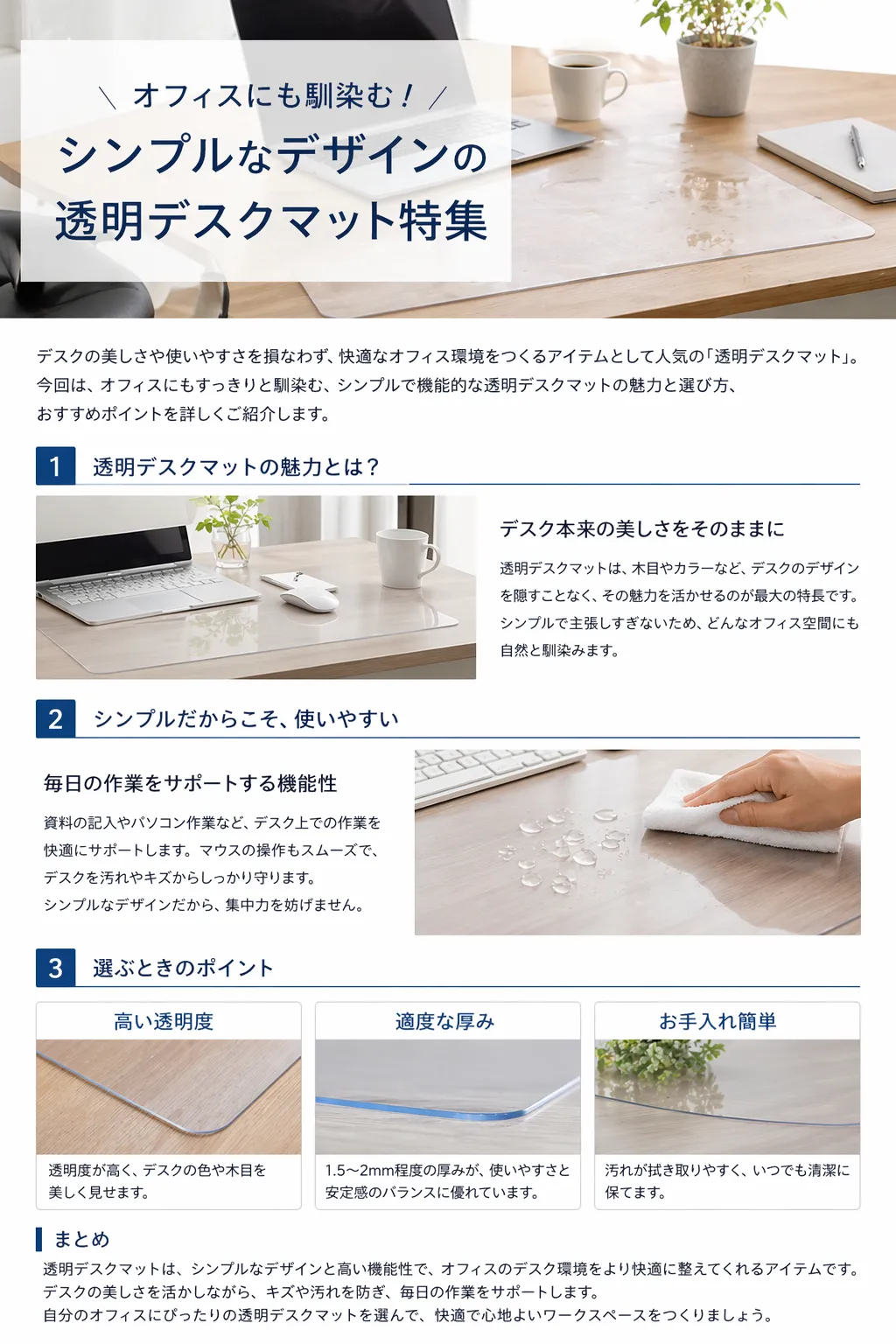今回は、オフィスにも自然に馴染む透明デスクマットの魅力と、選ぶときに意識したいポイントをご紹介します。